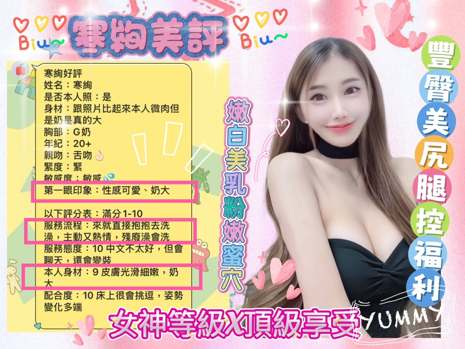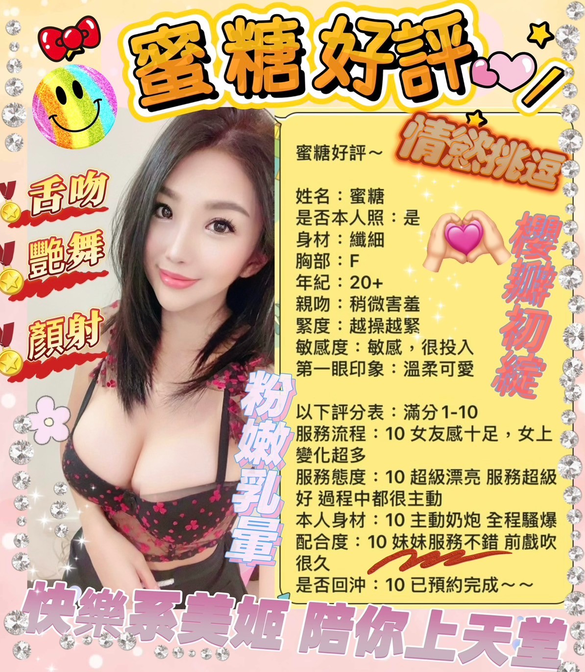 無套吹/甜蜜共浴/69/品鮑/小親親/舌吻/按摩/奶炮/水中蕭/深喉嚨/胸推/角色扮演(自備)/絲襪(自備)/情趣用品(自備)